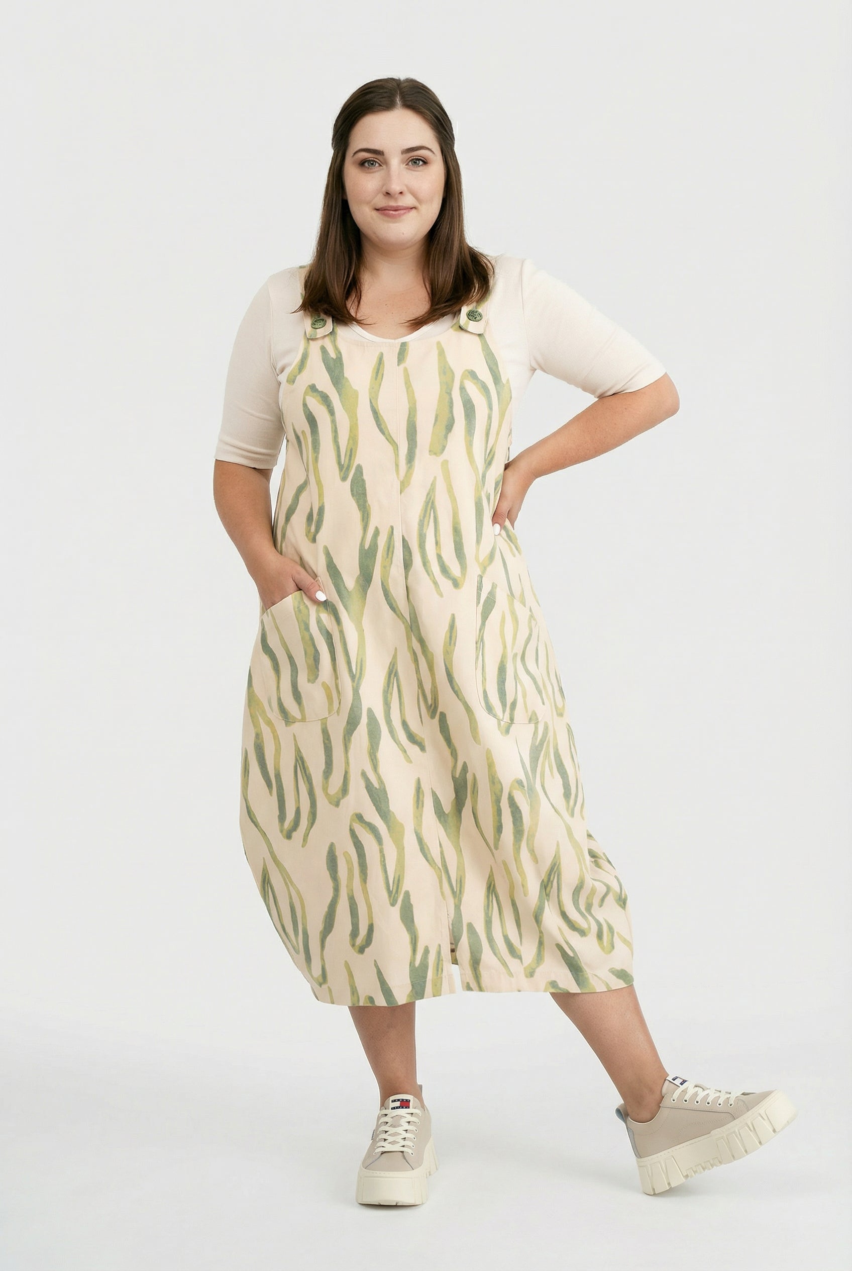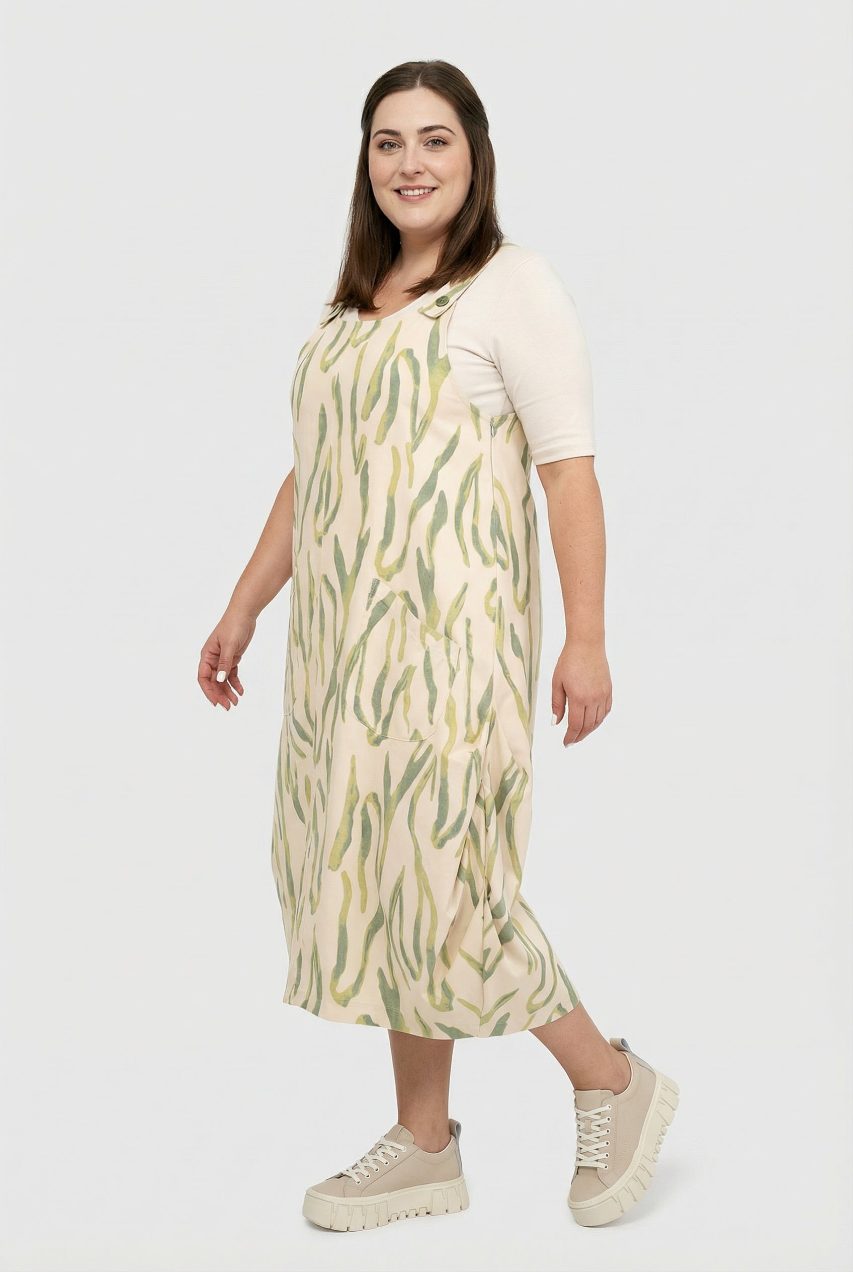 Design: stampa ondulata pittorica in verde salvia/oliva su beige sabbia – le linee verticali allungano la figura