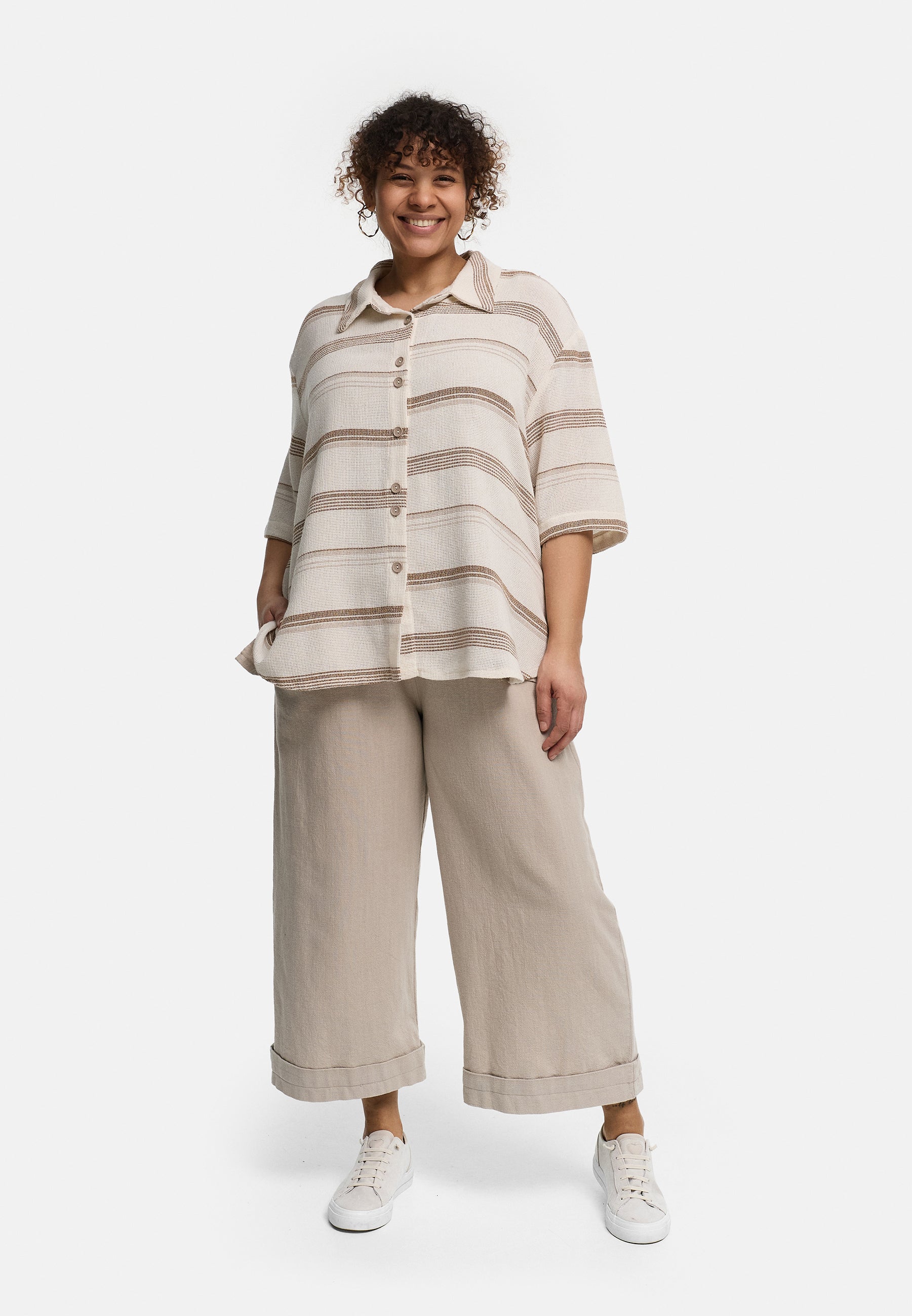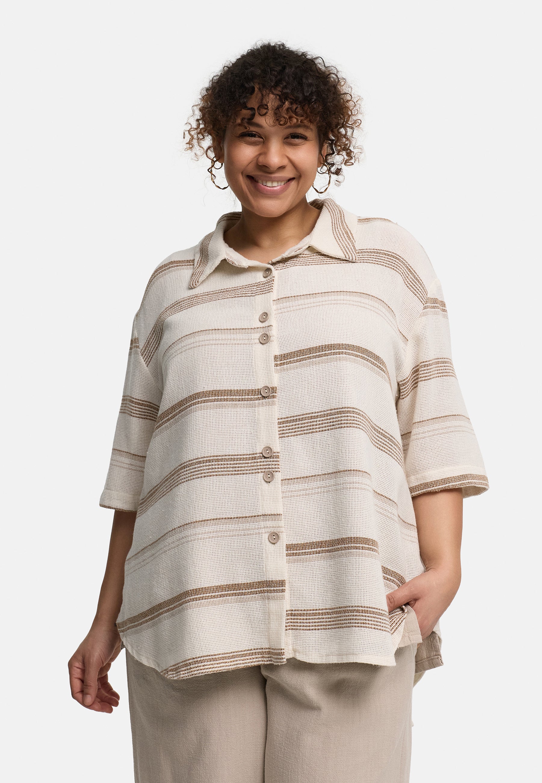 Das dezente Streifendesign in natürlichen Beige- und Cremetönen unterstreicht den zeitlosen, modernen Charakter der Bluse. Dank der durchgehenden Knopfleiste kannst du sie flexibel stylen – geschlossen als Bluse oder offen als leichtes Overshirt.